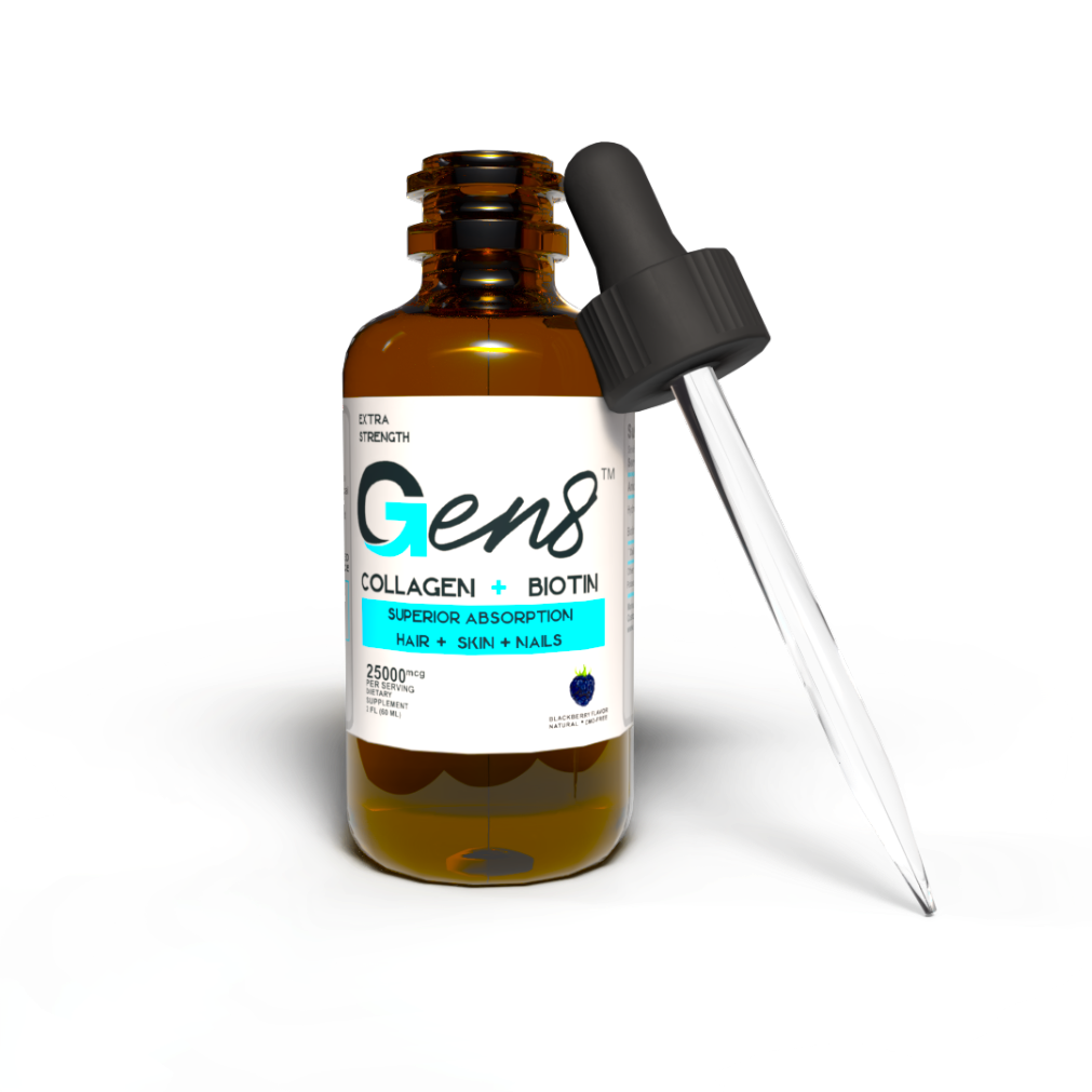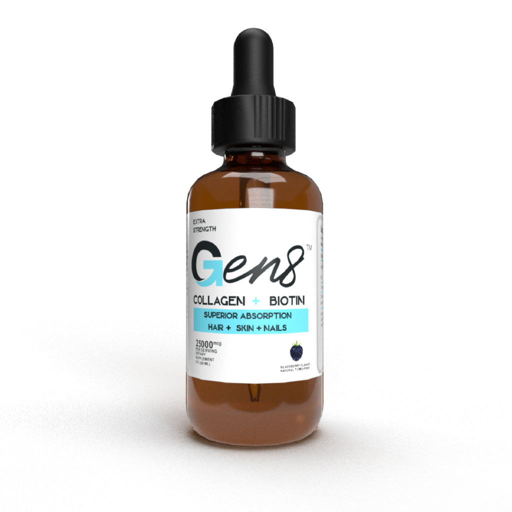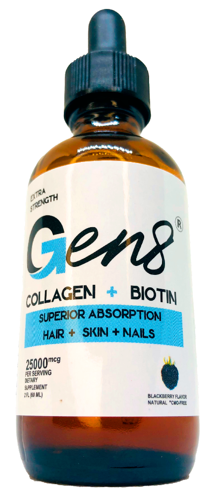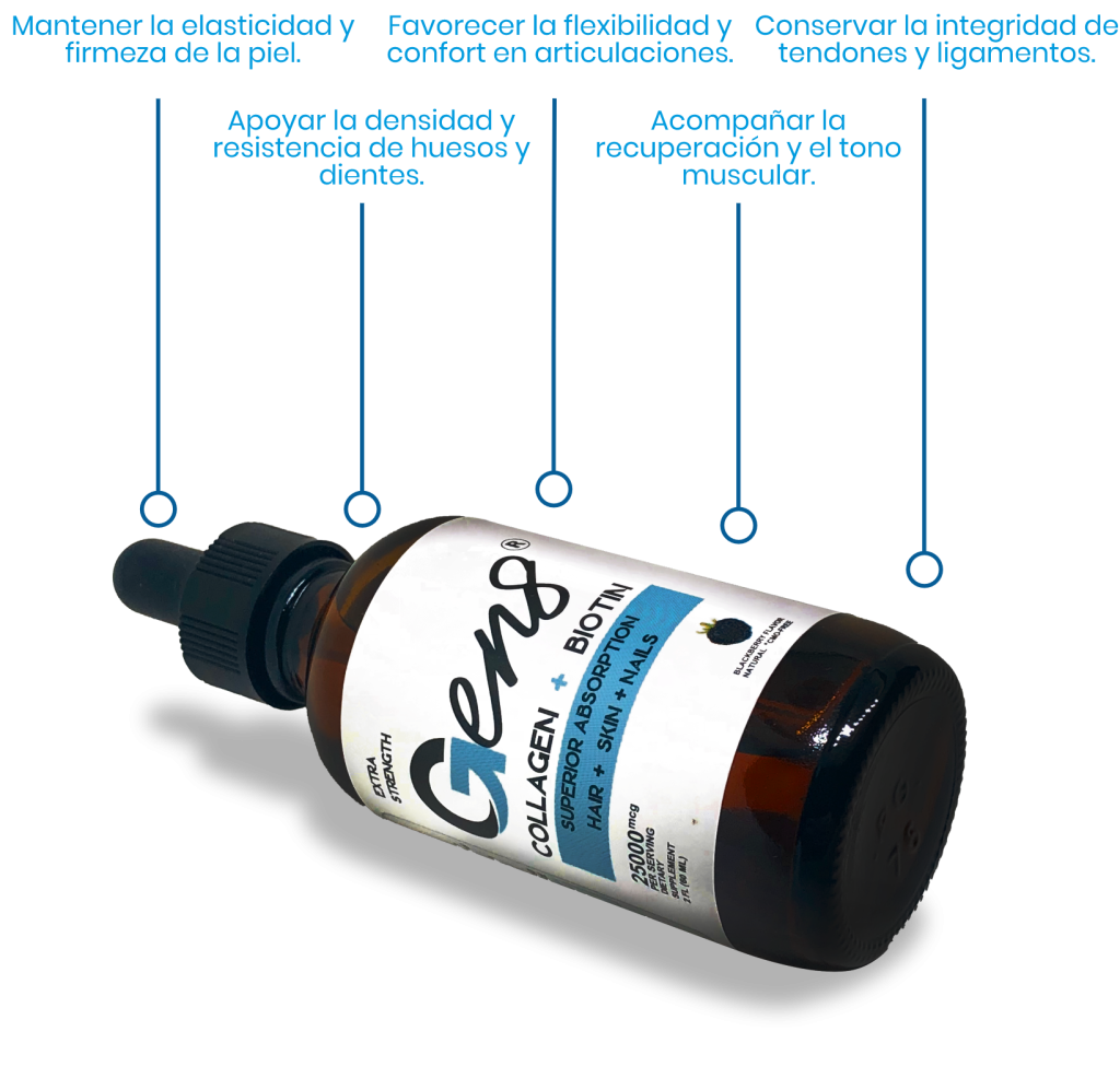 Gen8 es un suplemento líquido sublingual que combina colágeno hidrolizado y biotina, dos nutrientes esenciales para apoyar la salud de la piel, cabello, uñas, huesos, músculos y articulaciones.